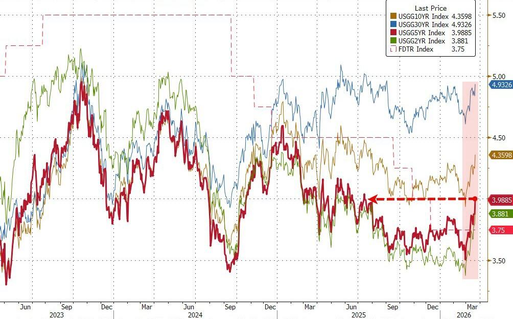 美債10年期收益率單日飆升13.4個點子,本周累計上漲逾10個點子;5年期收益率自7月以來首次突破4%,收益率曲線急劇平坦化。