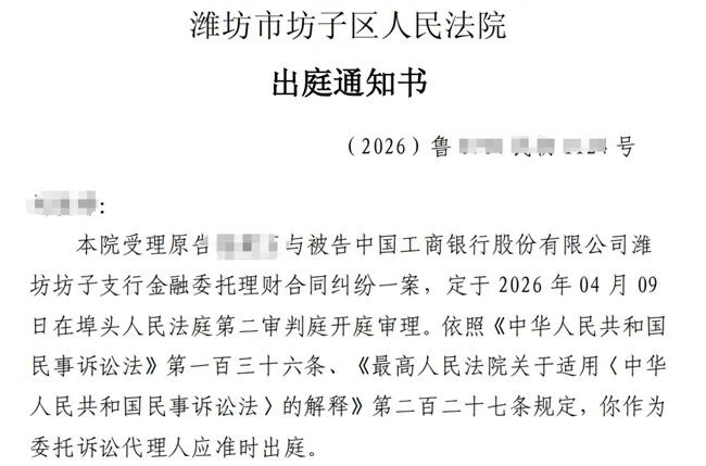 目前,許文華起訴工商銀行的案件已經立案。據許文華提供的出庭通知書等文件,今年3月6日,濰坊市坊子區人民法院受理許文華與被告工商銀行濰坊坊子支行金融委託理財合同糾紛一案,定於2026年4月9日開庭審理。