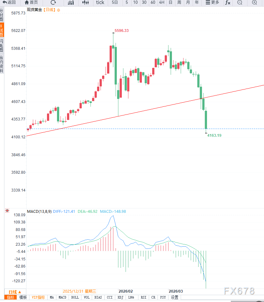 儘管如此,當前市場情緒的釋放仍未完全結束,黃金短期仍可能承壓。但隨着情緒逐步趨於極致,價格下跌斜率有望出現階段性修正。從技術結構來看,黃金中期已經跌破此前的上升趨勢線,這意味着趨勢層面已發生轉變。在基本面尚未出現明顯改善的情況下,任何反彈更多屬於修復性質,而非趨勢反轉。