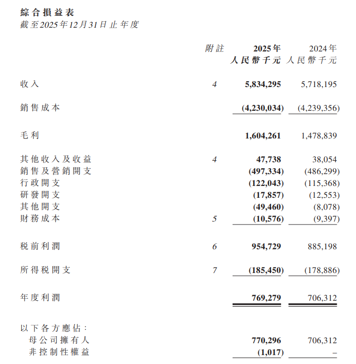 3月20日,周六福發布截至2025年12月31日止年度業績公告。公告顯示,截至2025年12月31日止年度,周六福集團收入由2024年同期約57.18億元增加2.0%至約58.34億元;毛利由約14.79億元增加8.5%至約16.04億元;淨利潤由約7.06億元增加8.9%至約7.69億元;母公司普通股權益持有人應占每股基本及攤薄盈利為1.88元,2024年為1.89元。