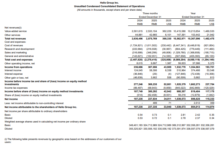 日前,陌陌母公司摯文集團(Nasdaq: MOMO)公布了2025年第四季度及全年未經審計的財務業績。