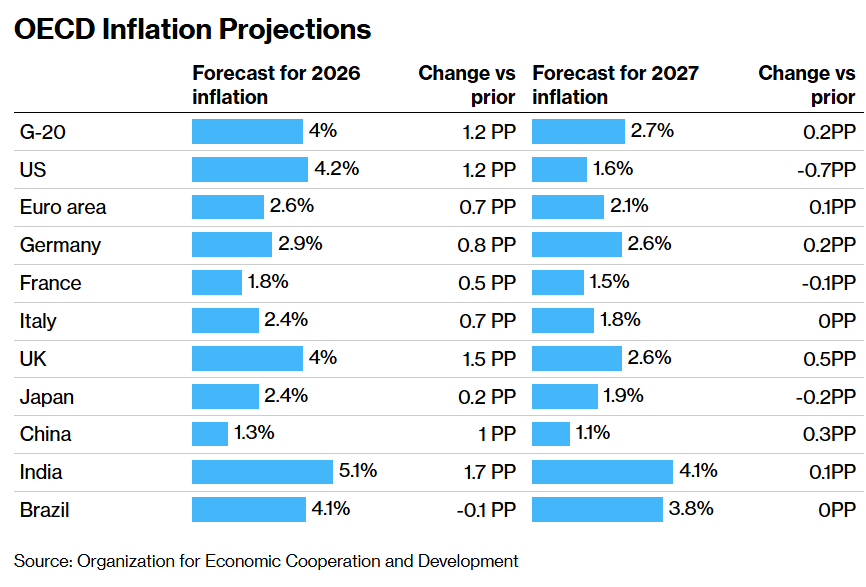 新一輪中東地緣政治衝突,正在把全球貨幣政策從「準備繼續或恢復寬鬆」重新推回「更久維持高利率、必要時重新轉鷹」的軌道。 這輪政策預期變化的核心不是銀行體系出問題,而是能源供給衝擊先把通脹預期重新點燃。OECD最新正式更新預測已把G20今年平均通脹上修到4.0%,並且把美國今年通脹上修到4.2%。