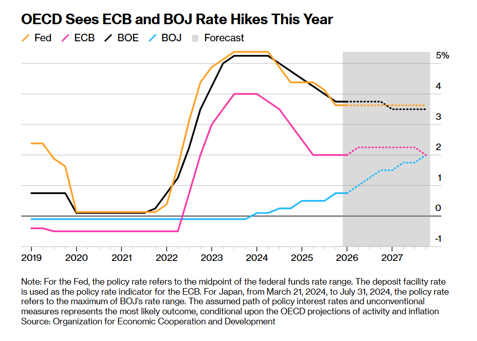 該組織目前預計,美國和英國的貨幣政策基準利率將在整個2026年維持不變,同時預計歐洲央行將在第二季度加息一次,以確保通脹預期繼續受到嚴格控制。如上圖所示,OECD預計歐洲央行和日本央行今年將加息。