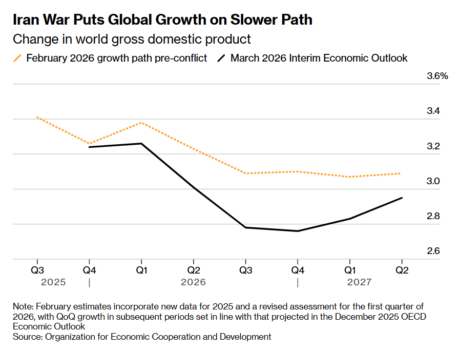 OECD在預測摘要中表示,如果沒有這場地緣政治衝突,該機構原本可能會把2026年全年的全球增長預測上調0.3個百分點。但現在,該經濟研究機構將該項預測維持在2.9%不變,並把2027年的全球經濟增長預測下調0.1個百分點至 3%。