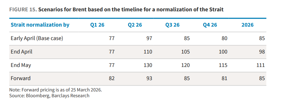 巴克萊認為,油價走勢將在三個關鍵時間節點上將出現分叉:若霍爾木茲海峽在4月初恢復正常通行,巴克萊維持2026年布倫特原油均價85美元/桶的基準預測;若推遲至4月底,均價或重新定價至約98美元/桶;若拖延至5月底,均價可能達111美元/桶。每延誤一天,累積的庫存缺口就以雪球效應向後傳導,推高價格中樞。