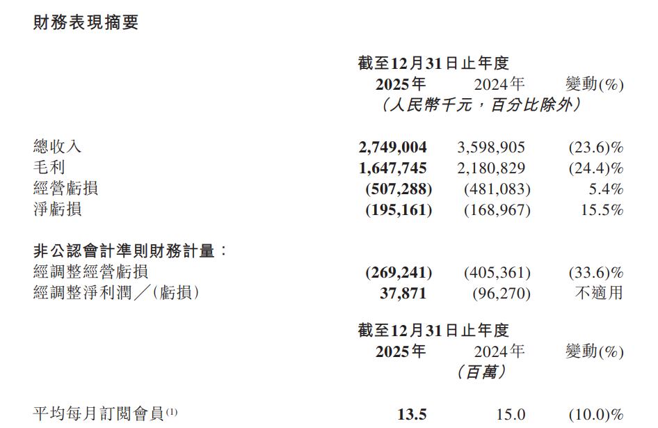 財報數據顯示,截至2025年12月31日,知乎全年營收27.5億元,按年下滑23.6%;在經調整淨利潤口徑下,公司錄得盈利3787萬元,而上年同期為淨虧損9627萬元。儘管Non-GAAP實現扭虧,但從美國通用會計準則(GAAP)來看,知乎淨虧損為1.95億元,較2024年的1.69億元虧損額按年擴大15.5%。