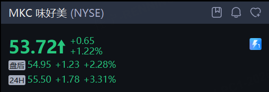 味好美 夜盤升逾3%。消息稱聯合利華接近與味好美達成合併協議,或創建600億美元食品巨頭。