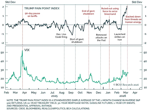 「TACO」模式是如此廣為人知,以至於分析師們開發了類似 BCA Research 的「特朗普痛苦指數」之類的工具,用來預測政策轉變何時可能發生。該指標追蹤短期股市波動、長期國債收益率、抵押貸款利率、汽油價格、通脹預期以及總統的支持率。