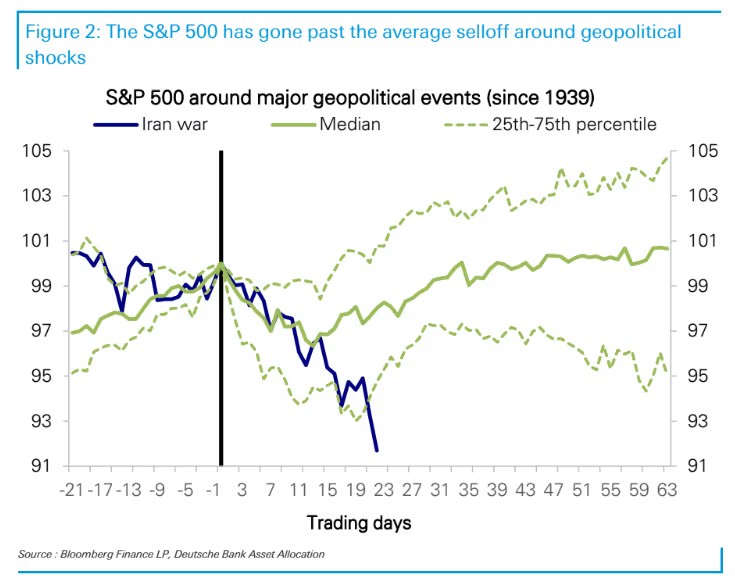 自2月27日收盤至今,標普500指數累計下跌7.4%,這一跌幅已超過德意志銀行統計的歷史地緣衝突事件中6.1%的中位最大回撤。