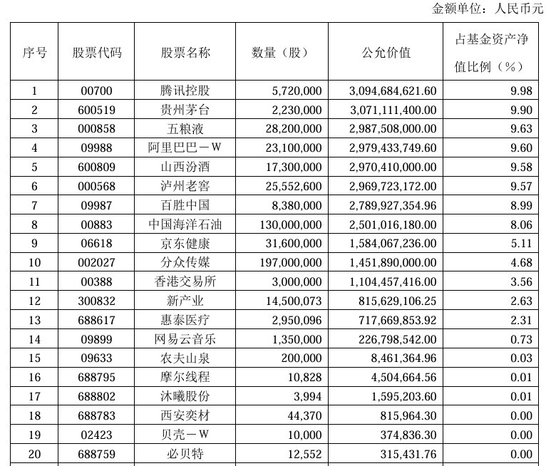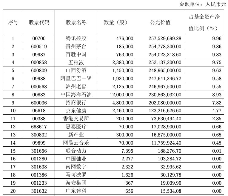 第12名至第20名重倉股依次為新產業(300832.SZ)、惠泰醫療(688617.SH)、網易雲音樂(09899)、農夫山泉(09633)、摩爾線程-U(688795.SH)、沐曦股份-U(688802.SH)、西安奕材-U(688783.SH)、貝殼-W(02423)、必貝特-U(688759.SH)。