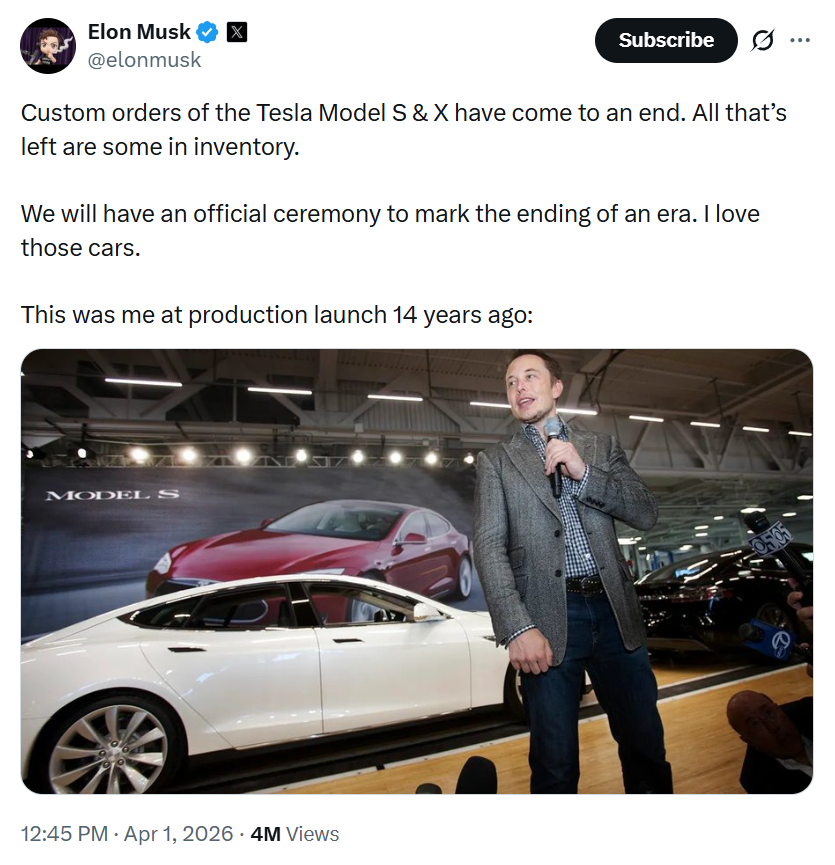 馬斯克4月1日在X平台發文稱:"特斯拉Model S與Model X的定製訂單已經結束,剩餘的只有部分庫存車。"他同時表示將舉辦正式儀式紀念這一時刻,並配發了14年前兩款車型量產啓動時的舊照,寫道:"我愛這兩款車。"