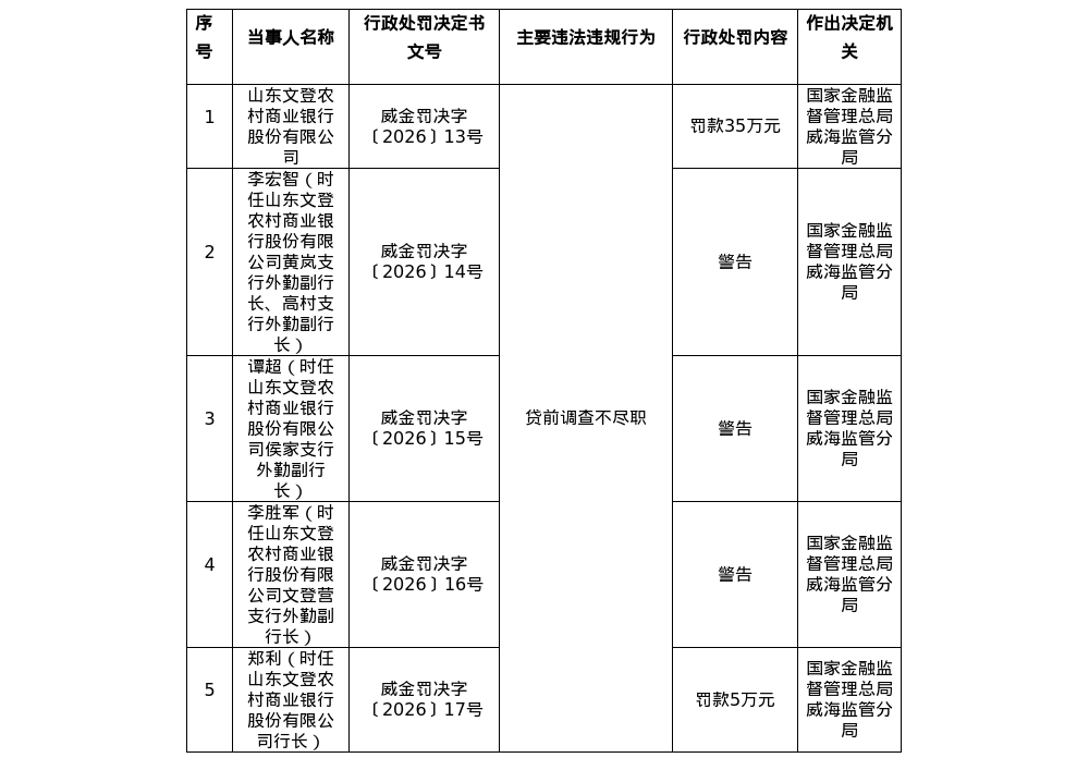 此外,李宏智(時任山東文登農村商業銀行股份有限公司黃嵐支行外勤副行長、高村支行外勤副行長)、譚超(時任山東文登農村商業銀行股份有限公司侯家支行外勤副行長)、李勝軍(時任山東文登農村商業銀行股份有限公司文登營支行外勤副行長)被給予警告;鄭利(時任山東文登農村商業銀行股份有限公司行長)被罰款5萬元。