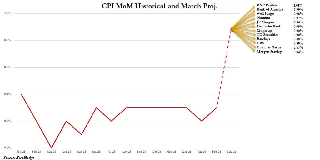 高盛預測整體CPI按月上漲0.87%,對應按年漲幅3.28%;摩根大通預測整體CPI按月跳升0.96%,按年漲幅達3.4%。路透社調查顯示,各機構估計區間分佈較廣,從0.4%到1.7%不等,反映出市場對油價衝擊幅度存在較大分歧。