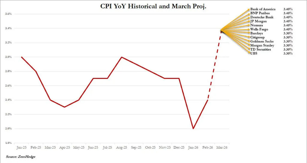 美國3月消費者價格指數(CPI)報告即將出爐,市場普遍預計這將是近四年來最大單月通脹漲幅。伊朗戰爭引發的能源價格衝擊是核心驅動力,而二次傳導效應尚未充分顯現,這將進一步壓縮聯儲局今年降息的空間。