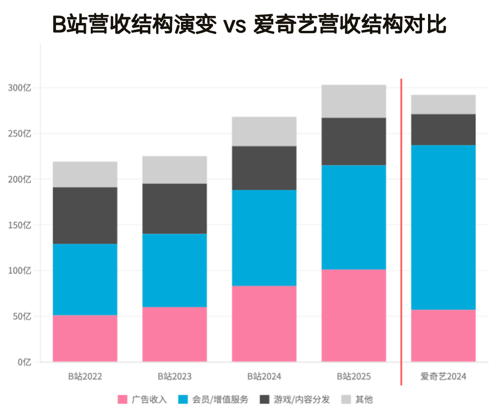B站廣告收入佔比從2022年的23%升至2025年的33%,正在向廣告驅動轉型;愛奇藝會員收入佔比超60%,但該板塊已持續下滑。