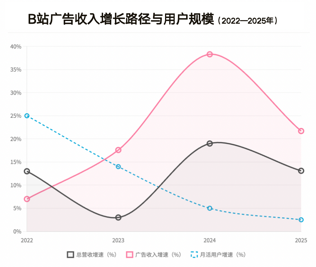 財報數據顯示,B站廣告收入增速持續高於總營收增速,月活用戶增速卻在2024年後顯著放緩,意味着單用戶廣告價值必須繼續提升。