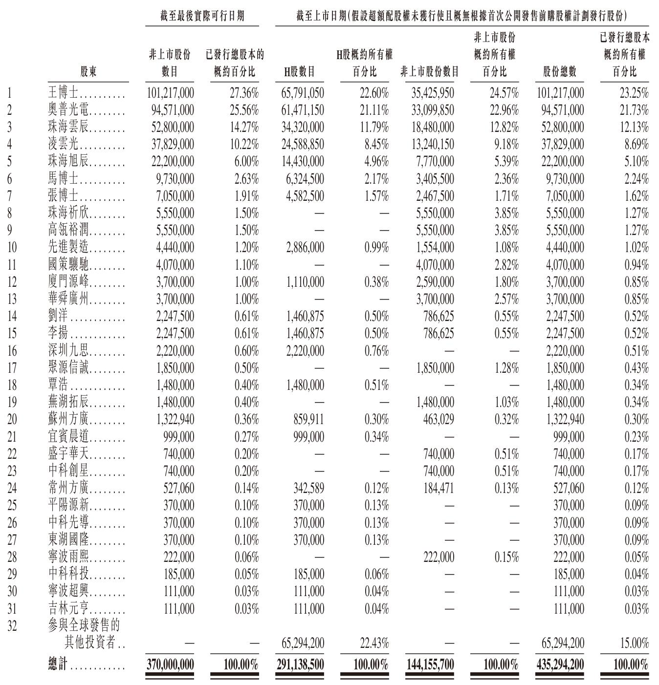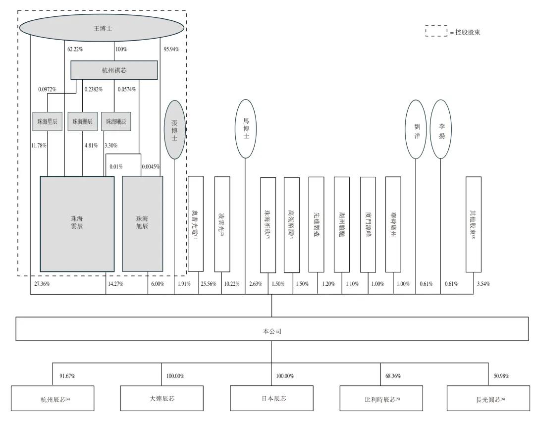 王欣洋博士持股27.36%,奧普光電持股25.56%,珠海雲辰持股14.27%,凌雲光持股為10.22%,珠海旭辰持股6%,馬成博士持股2.63%,張豔霞博士持股1.91%,珠海祈欣、高瓴裕潤分別持股1.5%,先進製造持股1.2%;