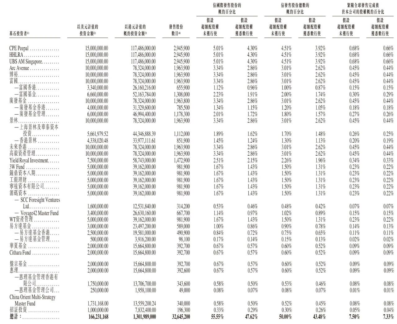 長光辰芯基石投資者分別為CPE Peepal、高瓴HHLR Advisors、UBS Asset Management (Singapore) Ltd.(「UBS AM Singapore」)、Arc Avenue Asset Management Pte. Ltd.(「Arc Avenue」)、博裕、富國、廣發基金、景林、未來資產證券(香港)有限公司(「未來香港」)、Perseverance Asset Management、Yield Royal Investment、3W Fund Management Limited(「3W Fund」)、鐘鼎資本八期投資有限公司(「鐘鼎資本八期」)、工銀理財有限責任公司(「工銀理財」)、寧遠資本有限公司、源碼資本、WT資產管理有限公司(「WT資產管理」)、易方達基金、華夏基金、Cithara Fund、盤京港景投資基金(「盤京基金」)、惠理、China Orient Multi-Strategy Master Fund、招商證券,上述基石投資者一共認購1.66億美元(約13億港元),佔總募資規模的55%。