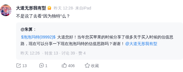 泡泡瑪特 大道您好!當年您買蘋果的時候分享了很多關於買入時候的估值思路,現在可以分享一下現在泡泡瑪特的估值思路嗎?謝謝!@大道無形我有型