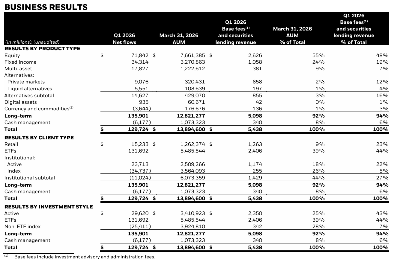 按業務劃分,Q1投資諮詢、管理費用及證券借貸總營收為54.38億美元,上年同期為44.01億美元;投資顧問績效費為2.72億美元,上年同期為6000萬美元;技術服務營收5.30億美元,上年同期為4.36億美元;分銷費為3.89億美元,上年同期為3.21億美元;諮詢及其他營收為6900萬美元,上年同期為5800萬美元。