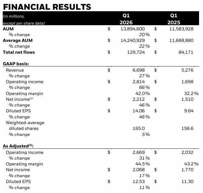 智通財經APP獲悉,全球資管巨頭貝萊德(BLK.US)周二美股盤前公布的2026年第一季度財報顯示,當季營收按年增長27%至67億美元,好於分析師普遍預期的64.63億美元。調整後的淨利潤為21億美元,按年增長17%;調整後的每股收益為12.53美元,好於分析師普遍預期的11.62美元。調整後的經營利潤為27億美元,按年增長31%;調整後的經營利潤率為44.5%,上年同期為43.2%。