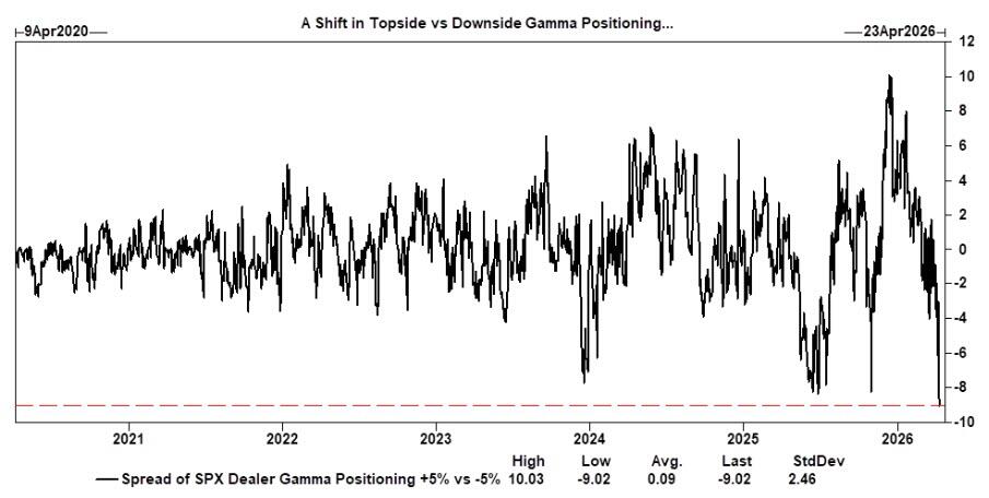 科技板塊此前經歷了激進的去風險化,倉位更為乾淨、敞口較輕,但基本面並未隨價格同步惡化,形成"價格與盈利預期之間的缺口"。做市商處於短伽馬狀態,廉價的上行期權仍具吸引力,一旦倉位充分重置、價格趨於穩定,上行期權價格可能快速重定價。