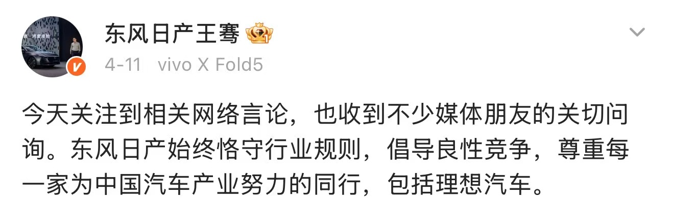 東風日產汽車銷售有限公司新能源品牌總經理王騫隨後回應稱,東風日產尊重每一家為中國汽車產業努力的同行,包括理想汽車。