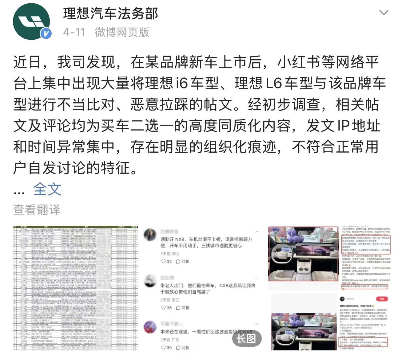 從理想汽車法務部曬出的截圖看,社交平台上大量帖子將理想i6、理想L6車型和東風日產新車NX8對比,結論均為「東風日產NX8更值得買」。
