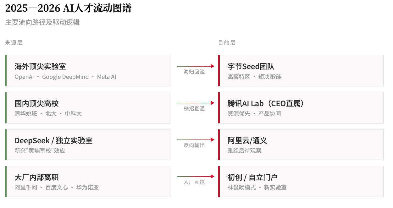 DeepSeek正在從人才「匯聚池」變成人才「出口商」。字節搶郭達雅,本質上是在通過購買「DeepSeek基因」來對衝自己的技術焦慮。而字節的Seed團隊、騰訊的CEO辦公室直屬AI實驗室,這些組織形態正在變得「去大廠化」:薪資透明度極低、資源配置極高、決策鏈條極短,以此來對抗林俊暘式的人才流失。