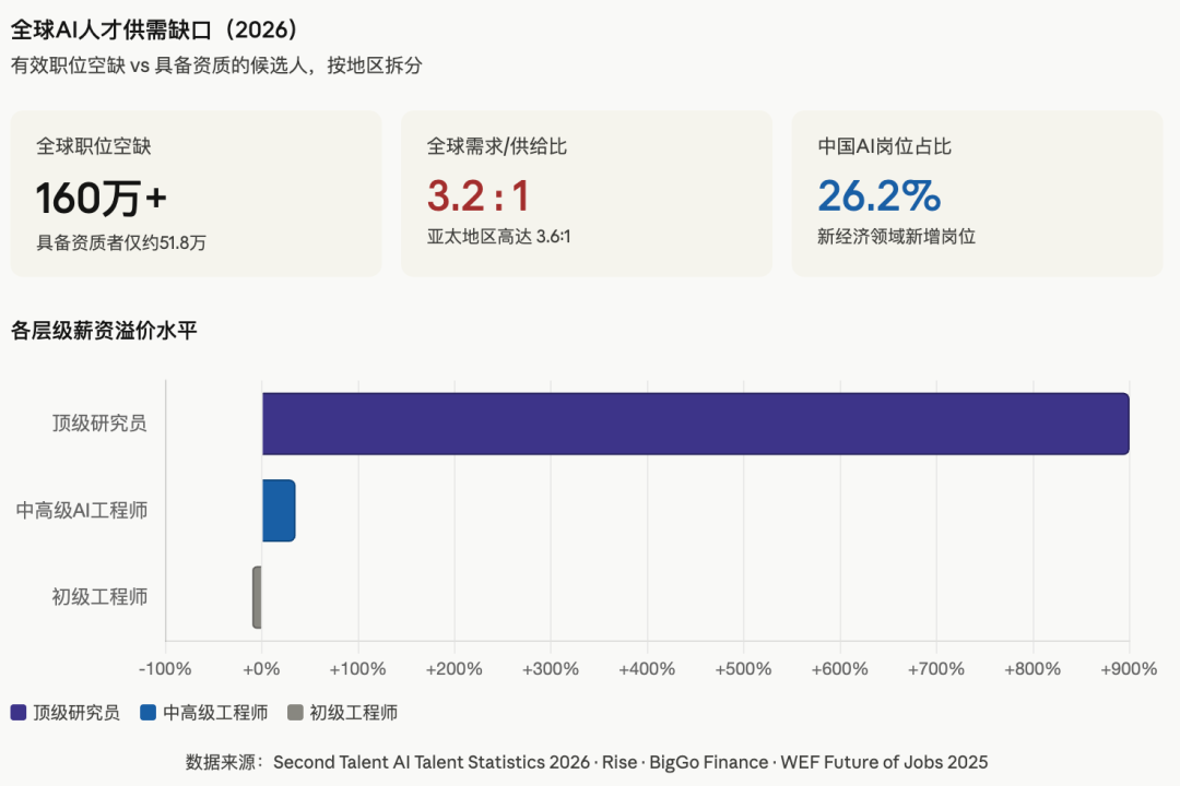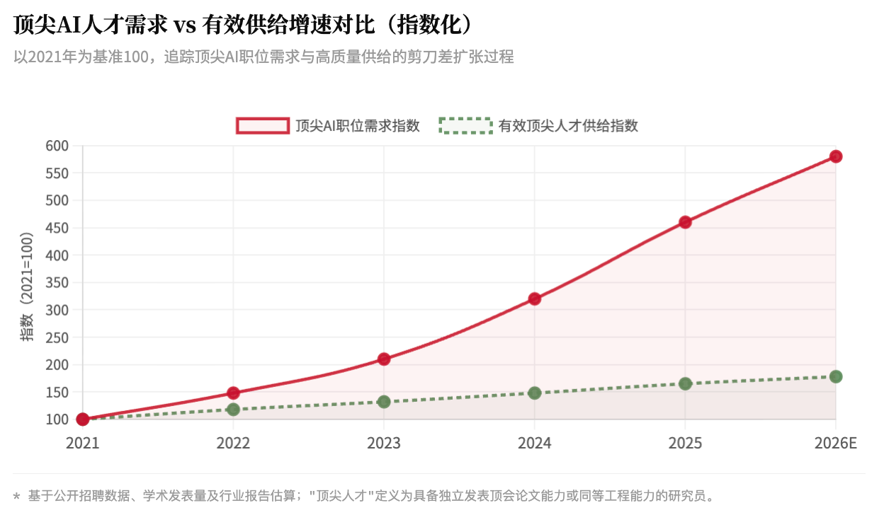 全球具備獨立主導前沿AI研究能力的人才,存量不超過數千人,且短期內幾乎無法通過教育體系快速補充。國內AI相關職位已佔新經濟領域新增崗位的四分之一以上,但AI崗位的供求比據業內機構估算仍低於全國平均水平。四家企業搶一個候選人,已成普遍現實。
