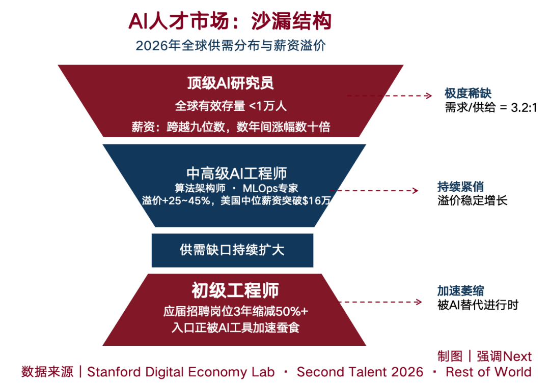 頂部:極稀缺,定價極度膨脹。全球頂級AI研究員的薪資在數年間跳漲數十倍,報價正快速向九位數逼近。中間層:AI相關的中高級工程師、算法架構師、MLOps專家,薪資溢價已比傳統技術崗高出25%至45%,美國AI專業人員中位薪資突破16萬美元,依然緊俏。底部:初級崗位正被AI本身侵蝕,入口收窄,還在加速。