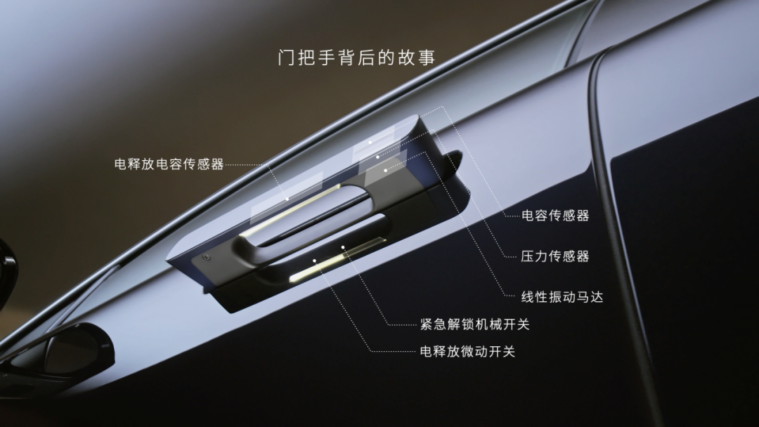 在功能方面,蔚來創新地在門把手中加入電容傳感器。用戶開門時只需輕輕觸碰把手內壁,電吸門就能解鎖彈出一條縫,避免用力拉門,開門過程優雅又輕鬆便捷。用戶還可以按壓把手外部的壓力傳感器,直接彈出門把手並同步電動開啓,一步操作便可解鎖開門。
