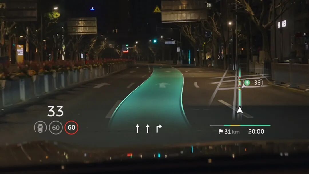 ES9搭載了行業最大的藍寶石雙焦面全焦段AR-HUD平視顯示系統,如果想讓雙焦平面真正實現近焦面儀表不穿車、遠焦面道路全融合,讓領先的硬件發揮出領先的效果,就必須做到路面信息與數字交互無縫融合。ES9採用了實時感知運算和空間融合技術,從智能輔助駕駛傳感器感知環境與本車狀態,到自研防抖運算與姿態補償實時渲染畫面,端到端的延遲不超過0.02秒,通過低時延徹底解決了AR-HUD失真、眩暈的問題。