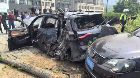 「人在裏面呢,走不出來。」視頻中前排駕駛員和副駕駛人員均被困車內。博主「路*」發文稱,該車為蔚來一代ES8,據傳高速(行駛中)從高架上衝下來,跨過高架下的主道和輔道,一路平推把樹和路燈杆都撞斷了。