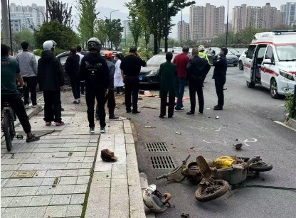 網友「那*了」發布的照片顯示,現場有交警和醫護人員到場,不遠處還有被撞倒的電動車及頭盔,以及一輛與蔚來ES8發生碰撞的黑色大衆轎車。