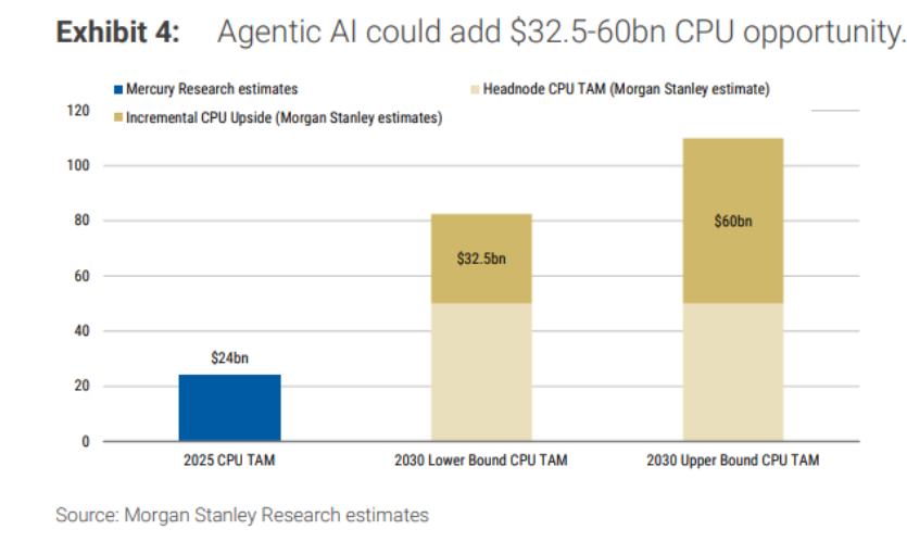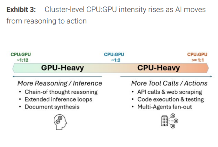摩根士丹利最新預測數據顯示,智能體大爆發標誌着從計算到編排的結構性轉變,由此推導出到2030年新增325億美元至600億美元的CPU增量市場空間,並將服務器級別CPU總TAM大幅擴至825億至1100億美元量級。TrendForce的一項預測報告則顯示,在AI智能體時代,CPU:GPU配比可能會從傳統AI數據中心的1:4至1:8,向1:1至1:2大幅重估。