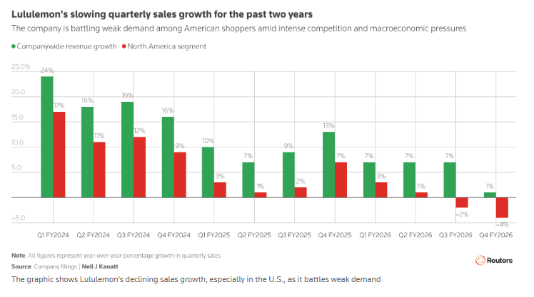 Lululemon近年還遭遇了包括「透視瑜伽褲」質量爭議、產品化學物質擔憂以及多次令人失望的業績指引。前CEO Calvin McDonald於今年早些時候離職,其離任消息反而一度刺激股價強勁反彈,與此次新帥任命引發的跌幅形成鮮明對比。