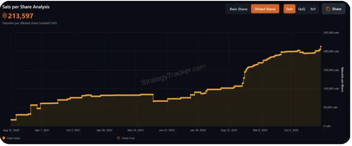 表面上看,對於普通股股東而言,繼續支持這些並不能轉化為自身上行收益的「收益率」,似乎是一種非理性的行為——在持續發行的情況下,每股對應的 BTC 持有量並未出現實質性提升(當然,這在很大程度上也源於 Strategy 本身體量已經過於龐大)。
