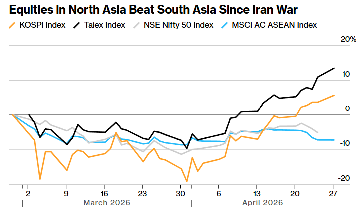 伊朗戰爭以來,北亞股市表現優於南亞股市