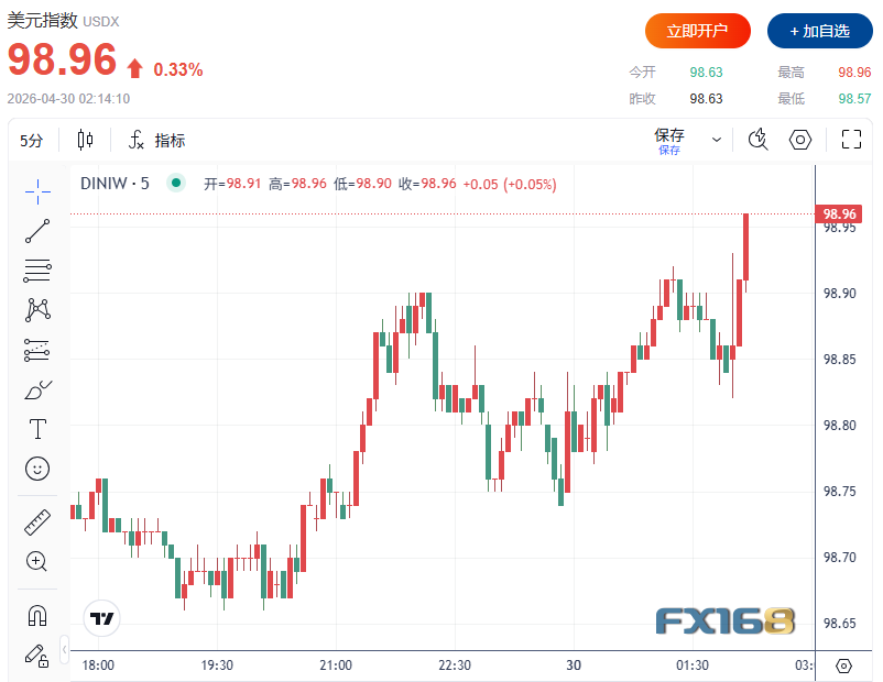聯儲局利率決議公布後,美元指數DXY短線走高14點,刷新日高至98.96。