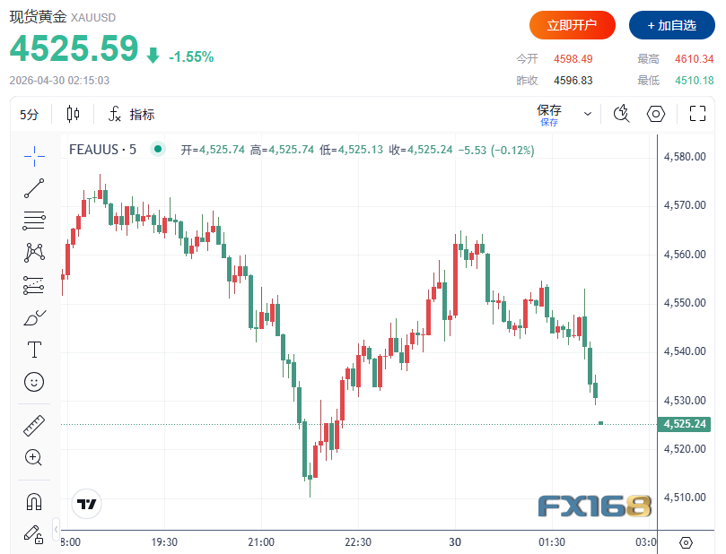 現貨黃金短線走低28美元,至4525美元/盎司一線交投。