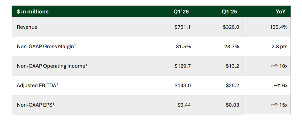 公司Q1營收7.511億美元,按年大漲130%,非GAAP每股收益0.44美元,均大幅超預期。公司同步將全年營收指引上調至34-38億美元,增速中值從60%提升至80%。甲骨文旗下Project Jupiter數據中心全部電力換成Bloom燃料電池,CEO說道,「Bloom正迅速成為現場供電的標準和首選方案。」