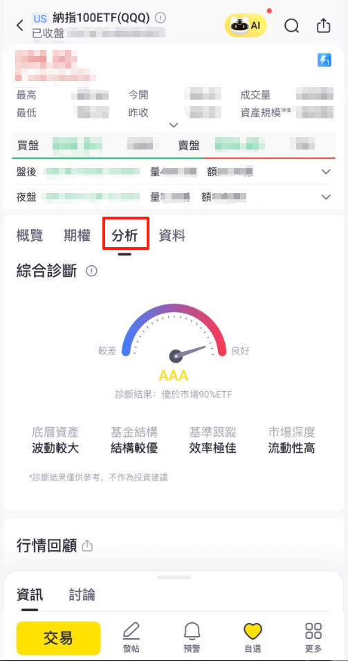 以其中嘅納指100 ETF (QQQ)為例,點擊「分析」,就可以睇到來自老虎官方嘅診斷數據。喺呢個數據度,波動較大,流動性高嘅 ETF ,網格交易策略嘅適用性更好。