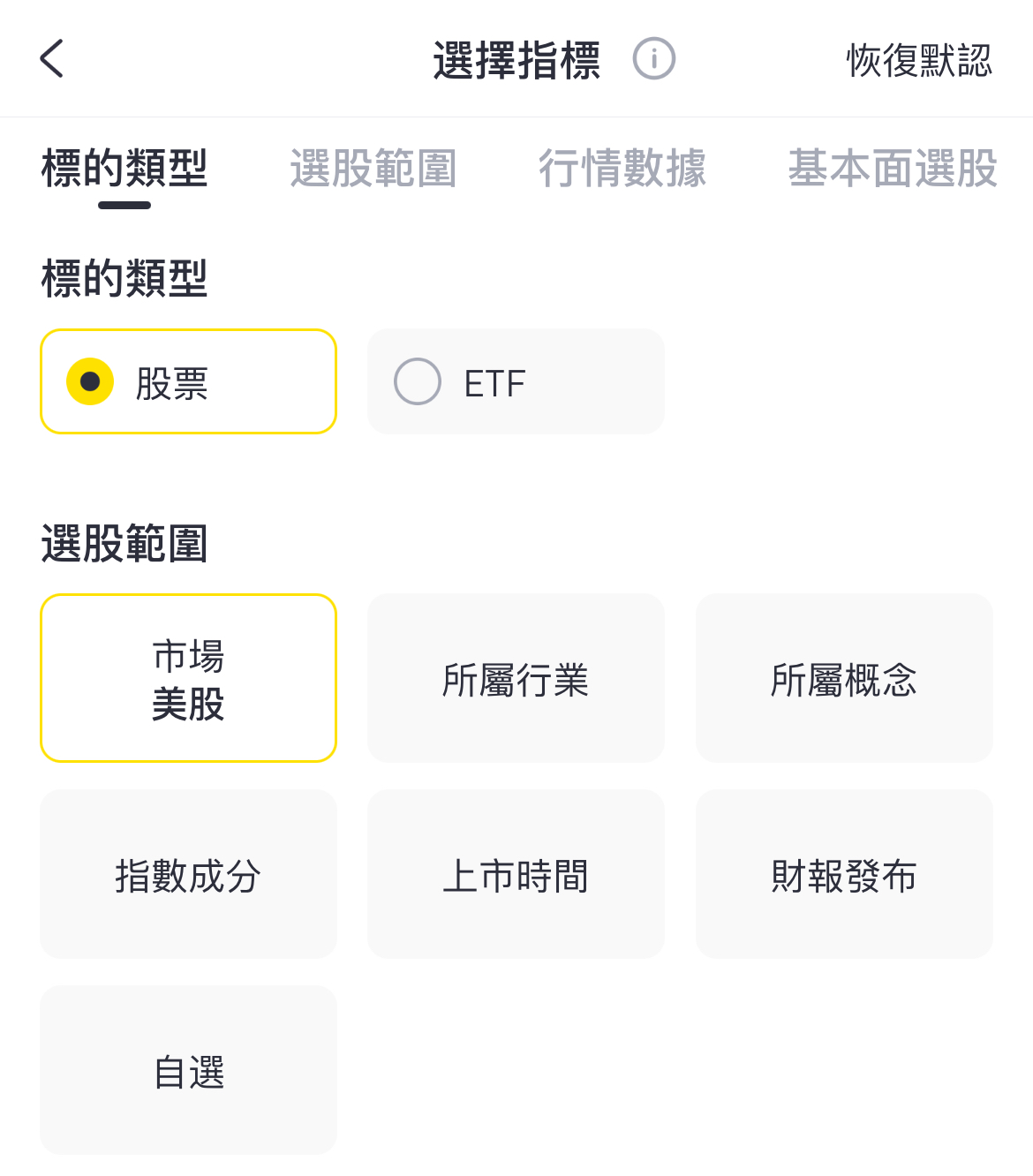 第二步:選擇股票-美股範圍,按照行情數據和基本面數據篩選,如果長期投資可以用基本面數據篩選。