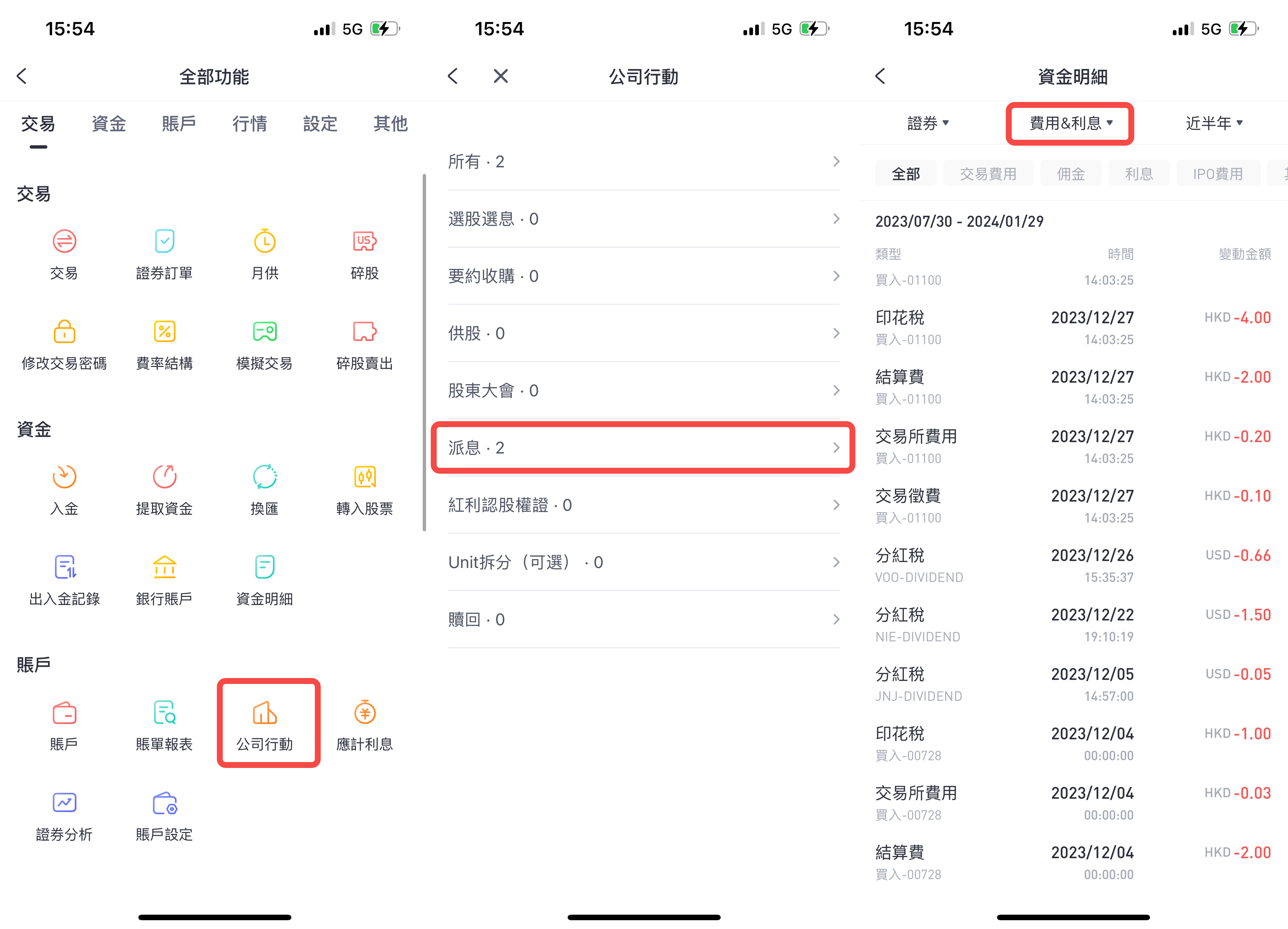喺Tiger Trade,你可以通過持倉-更多-公司行動查看分紅詳情,仲可以進入資金明細-費用&利息入面查看您所扣繳嘅股息稅明細。