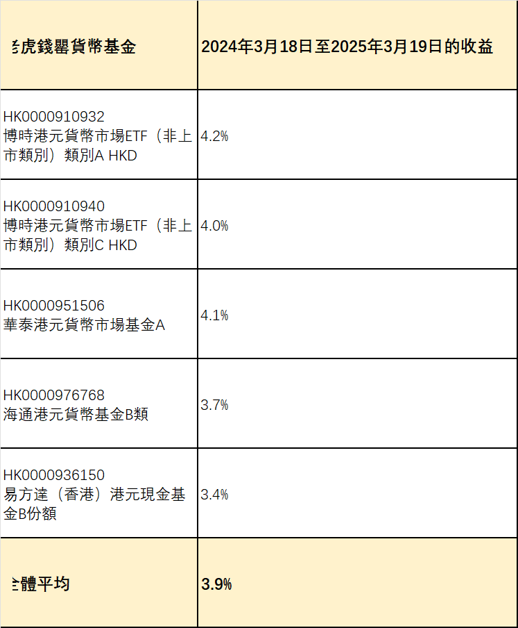 港幣貨幣市場基金平均回報率是以老虎錢罌中存續超過一年的港幣貨幣市場基金(ISIN :HK0000910932,HK0000910940,HK0000951506,HK0000976768,HK0000936150)的過去一年回報率的平均值(由2024年3月18日至2025年3月19日)計算得出的。它基於這些貨幣市場基金過去一年(截至2025年3月19日)的實際回報。