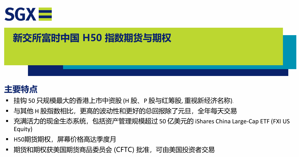 同樣在新加坡交易所掛牌的 H50 期貨,標的為香港上市的 50 隻市值最大中資股,亦具備近 20 小時的長時段交易特性,讓投資者即便在香港市場休市期間,仍可透過 H50 期貨針對市場變化及時做出反應。
