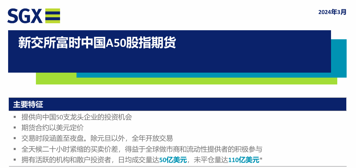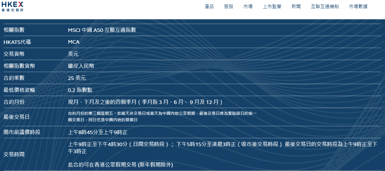 新加坡交易所的 A50 期貨,以富時中國 A50 指數為標的。交易時間為週一至週五上午 9:00 至 16:30,夜盤交易時間則自 17:00(北京時間)持續至隔日 4:45,交易時段涵蓋亞洲、歐洲與美洲的主要交易時間,這也意味著在中國市場休市期間,A50 期貨仍維持活躍交易。