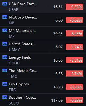 Rare Earth Stocks Tumbled. USA Rare Earth down 9%; MP Materials and NioCorp Developments down 8%; UAMY and Energy Fuels down 3%.