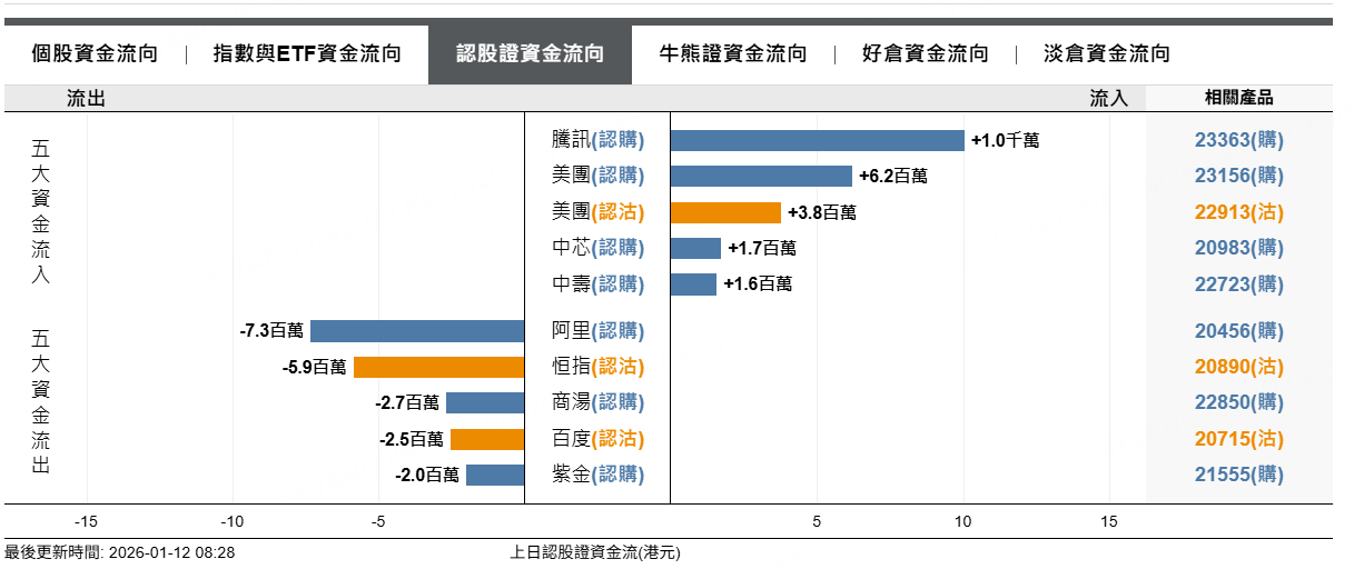 恒指熊證上日淨流出1500萬元,阿里巴巴牛證淨流出1200萬元。